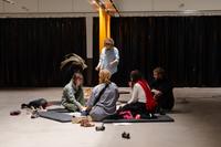 - Menší prostor s pódiem oddělený závěsy a knihovnickými regály, může být využitý pro intimnější zázemí programu. Vstup bez nápojů a bez bot. Zamýšleno i jako zázemí pro rodiče s malými dětmi na sezení/ležení.