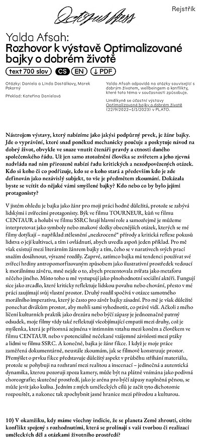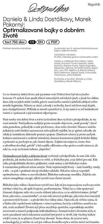 Naše touha vést dobrý život a trávit čas kvalitně dnes vychází z předpokladu, že nic není statické. Dobrý život byl něco jiného koncem 19. století, kam spadá zřízení ostravských městských jatek, a jinak ho vidíme dnes, kdy na jejich místě vznikla galerie současného umění a zabíjení zvířat ztratilo legitimitu. Navíc snad nikdo už nemůže říct, že žádný volný čas nemá. Přesto jsme svým způsobem uvězněni ve své každodenní rutině a neustále se pokoušíme pochopit, jak vlastně žijeme. Optimalizujeme, protože snaha žít dobře s ohledem na sebe i na druhé, k nimž řadíme také mezidruhové interakce a přírodu, to vyžaduje. Prostřednictvím děl patnácti umělkyň a umělců různých generací se výstava zamýšlí nad pojmem dobrý život i jeho dobovou a individuální podmíněností. S nadsázkou, groteskně, empaticky, ironicky i kriticky nabízí výstava prostor k intenzivnímu zážitku a volnému zamyšlení nad otázkou, co vlastně je dobrý život a jak jej máme vést.